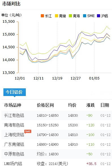 鋁錠價格今日鋁價2018-1-12